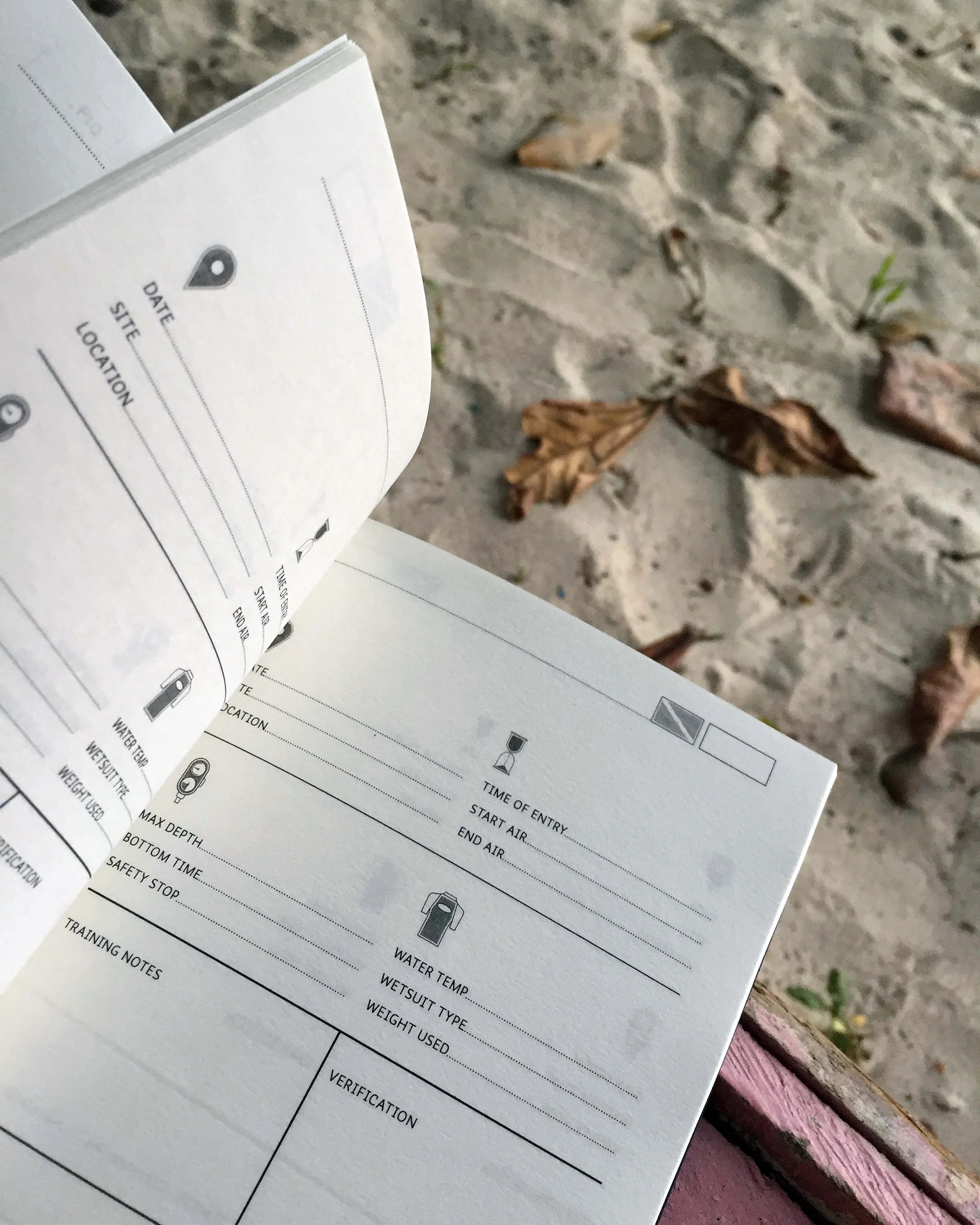 The inner pages, printed on a lightly textured, off white stock, were used to log dives. I split information into sections, with illustrated icons that corresponded with each.