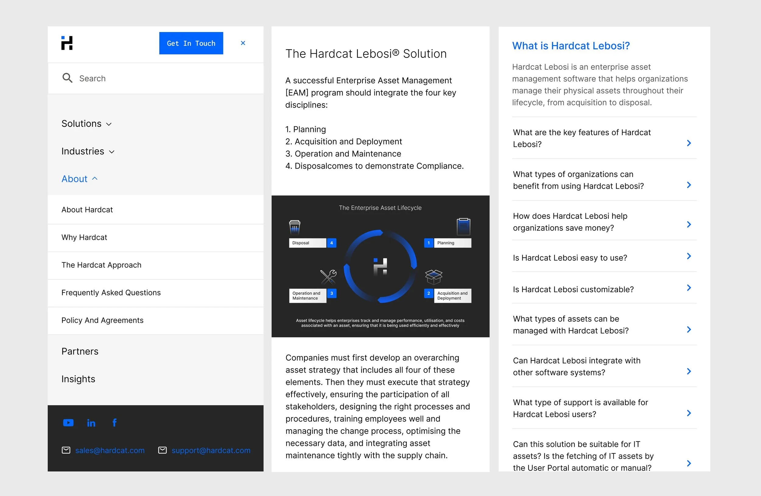 With clearly articulated goals, we spent a great deal of time building wireframes and prototyping continuously to ensure that the user experience for each kind of stakeholder was effortless and enjoyable. We created a navigation system with clear headings and a nested system that ensured users weren’t overwhelmed with an overload of information, but at the same time, could easily find anything specific they were looking for. It was equally important to ensure that the website was easy for the Hardcat team to manage, edit and add to, and so we took on the task of creating a system with easy-to-use templates that allowed for easy updates without being restrictive.